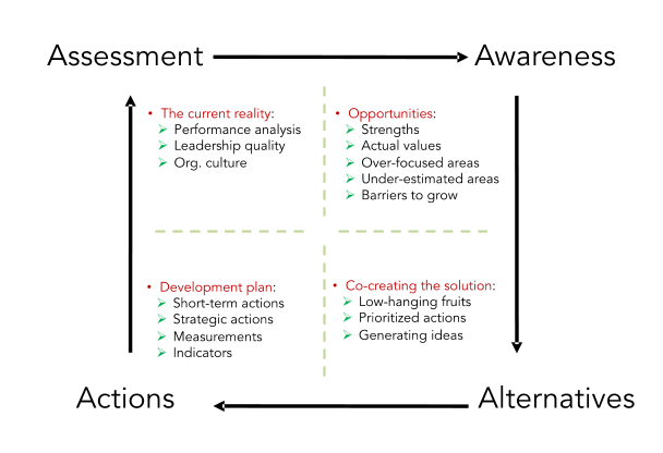Our structured sequence of activities starts by analyzing the current level of performance, to identify opportunities for improvement, and designing a unique customized solution for each organization.